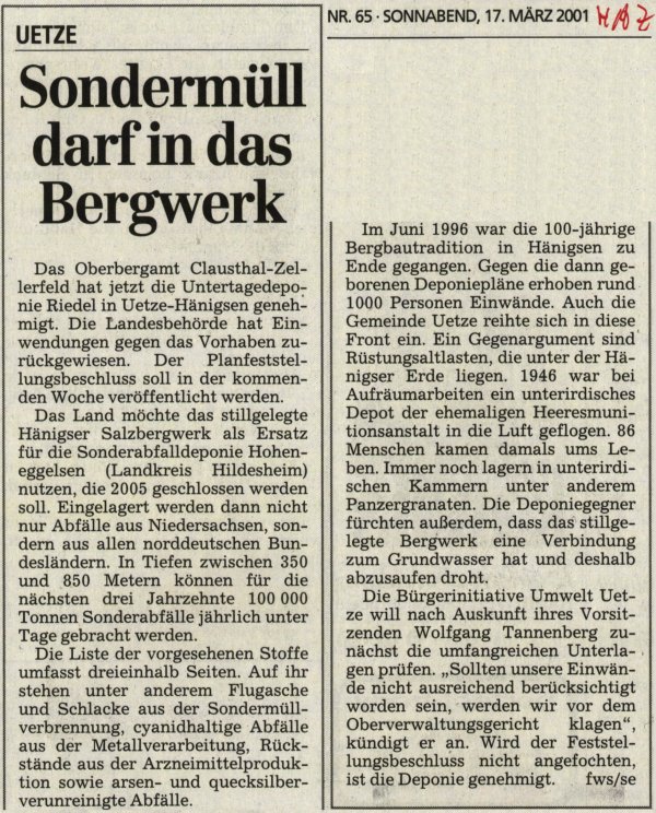 | 17. März 2001: Untertagedeponie Riedel in Uetze-Hänigsen vom Oberbergamt Clausthal-Zellerfeld genehmigt