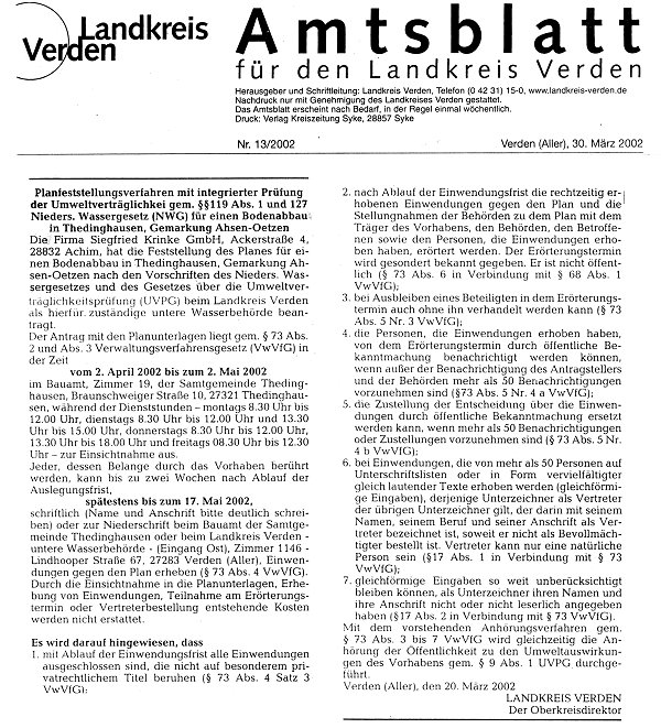02. April 2002: Die Untere Wasserbehörde des Landkreises Verden (Aller) hat die Antragsunterlagen zum Planfeststellungsverfahren mit integrierter Prüfung der Umweltverträglichkeit gem. §§ 119 Abs. 1 und 127 Nds. Wassergesetz für einen Bodenabbau der Firma Siegfried Krinke GmbH (Achim) in der Gemarkung Ahsen- Oetzen (Gem. Morsum) zur Einsichtnahme ausgelegt.