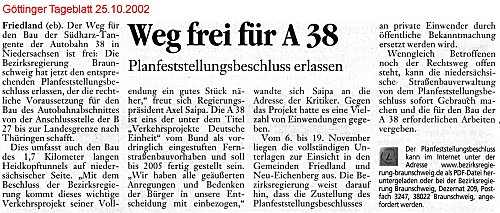 | 24. Oktober 2002: Bezirksregierung Braunschweig veröffentlicht Planfeststellungsbeschluss für die Verkehrseinheit 2 des niedersächsischen Abschnitts der Bundesautobahn A 38 'Südharzautobahn'