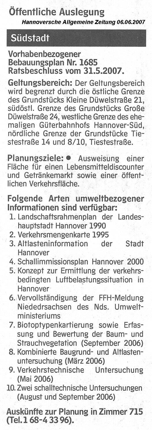 07. Juni 2007: Vorhabenbezogener Bebauungsplan Nr. 1685 liegt öffentlich aus (Ausweisung einer Fläche für einen Lebensmitteldiscounter und Getränkemarkt sowie einer öffentlichen Verkehrsfläche an der Tiestestraße, Hannover)