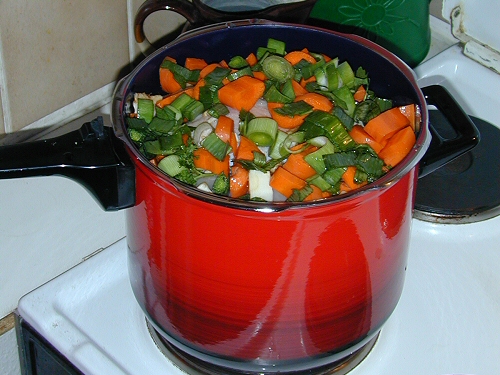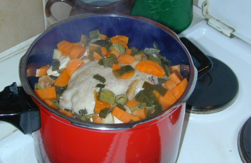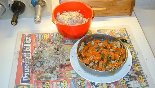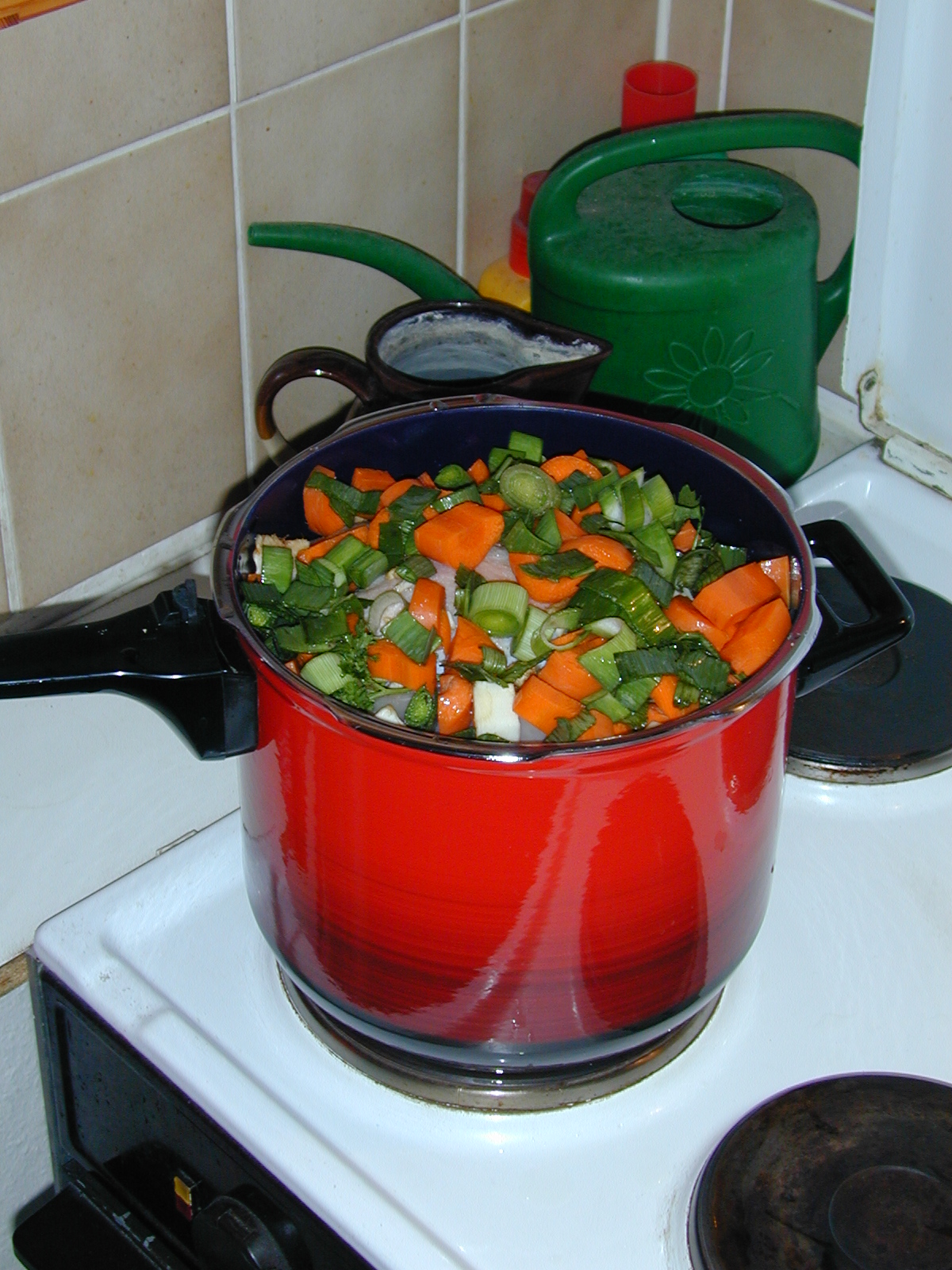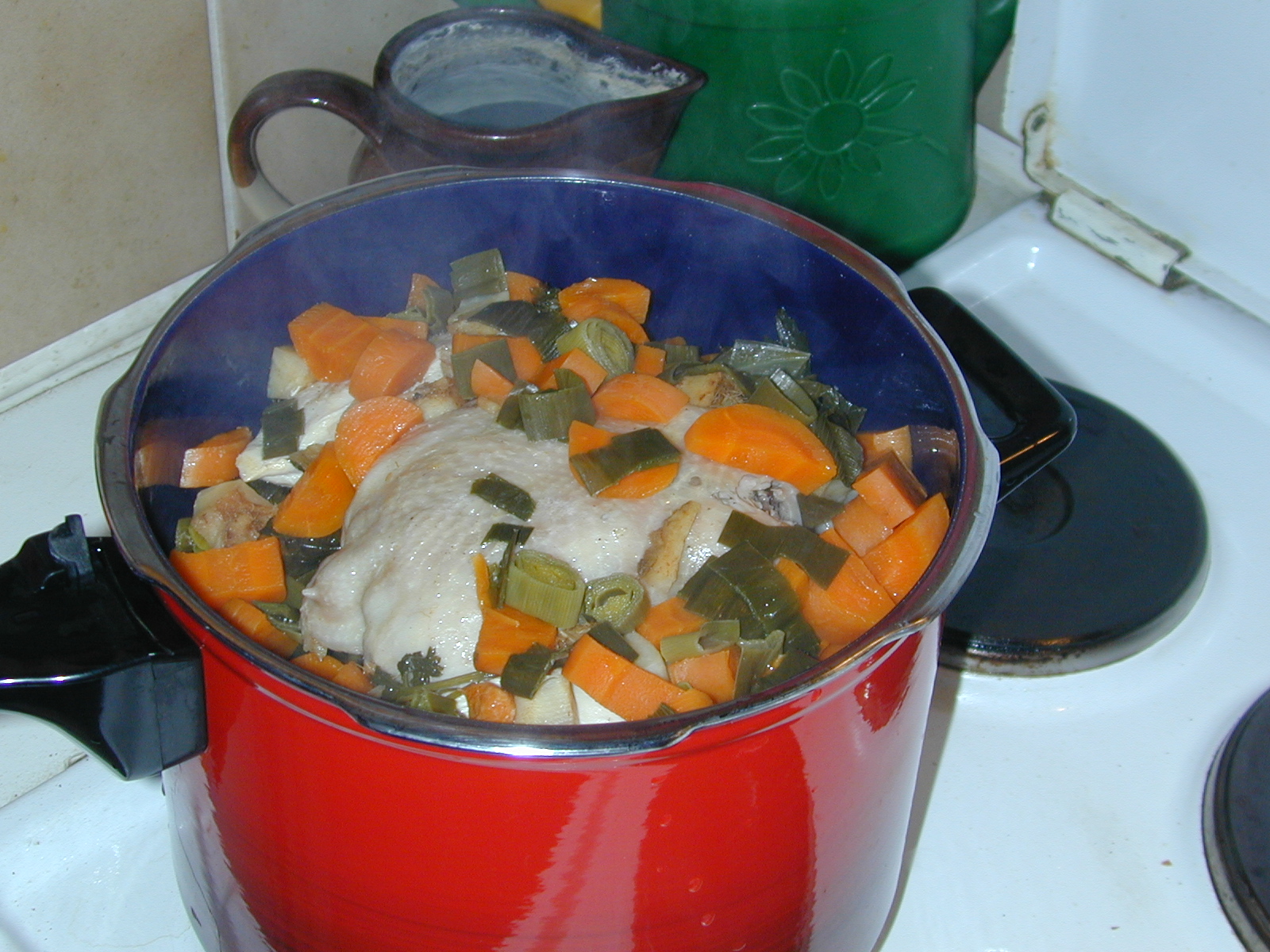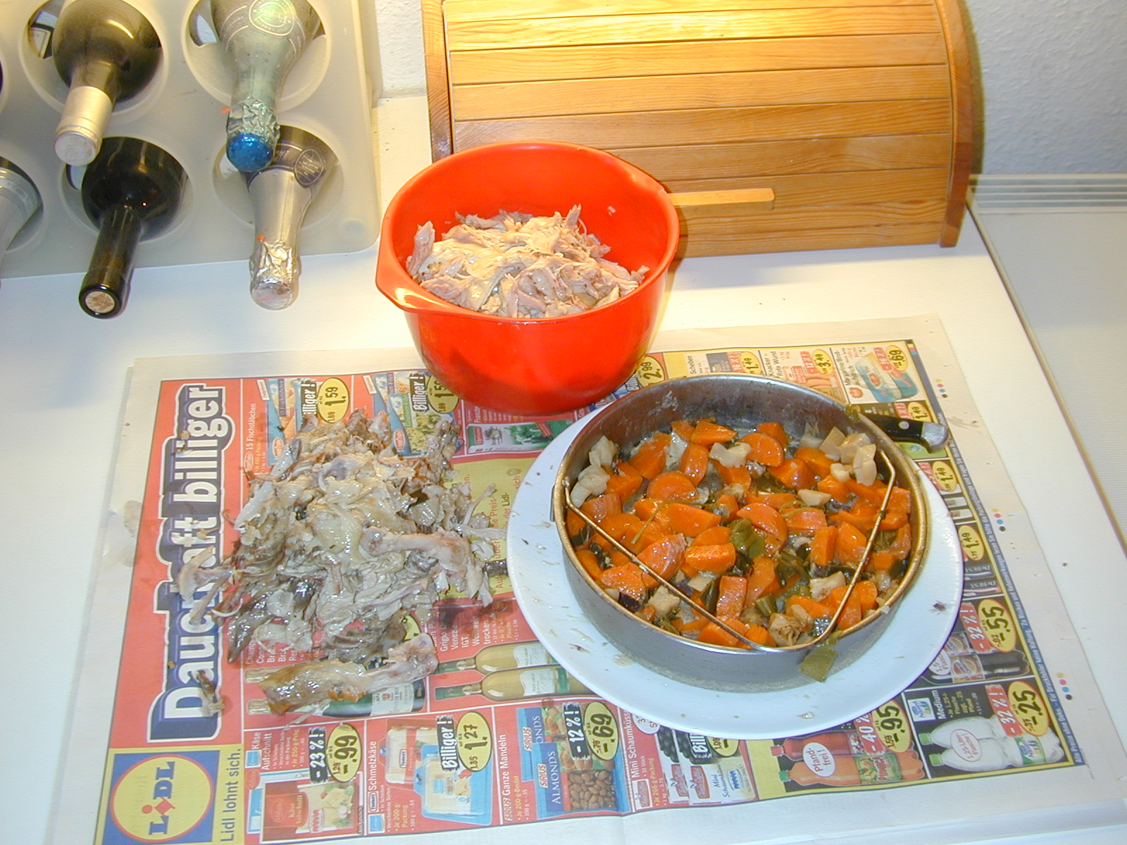 Das tote Tier mit jeder Menge Suppengrün im Dampfkochtopf ca. 20 min. garen ...