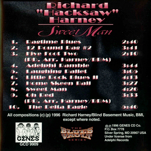 "Errata: In the liner notes, we mistakenly attribute the nickname 'Hacksaw' as originating during the artist's brief career in boxing. Pinetop Perkins set the record straight by reminding us that this outstanding musician (equally stunning as a piano player) supported himself by tuning and repairing pianos. 'He always carried a little hacksaw with him, and he could grab a piece of anything and make a new key with that hacksaw. He taught me how to repair a piano'." (from Adelphi Records site)