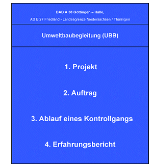 | 03. Juli 2003: Astrid Sievert berichtet anlässlich der diesjährigen Dienstbesprechung der Landespfleger in der niedersächsischen Strassenbauverwaltung über ihre Erfahrungen mit der 'Ökologischen' Baubegleitung (= Umweltbaubegleitung) beim Bau der "Südharzautobahn"